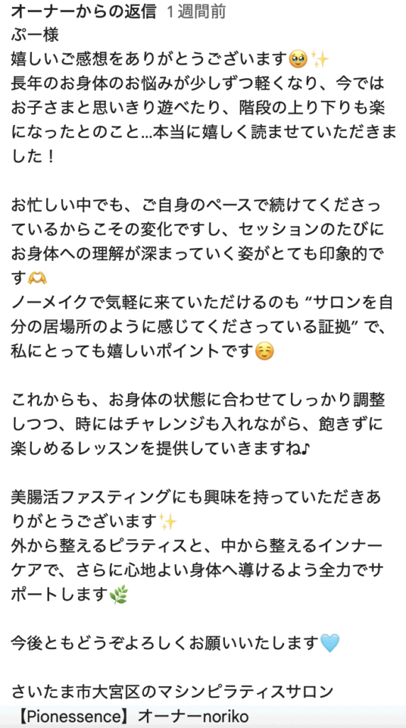 長年のお身体のお悩みが少しずつ軽くなり、今ではお子さまと思いきり遊べたり、階段の上り下りも楽になったとのこと…本当に嬉しく読ませていただきました!